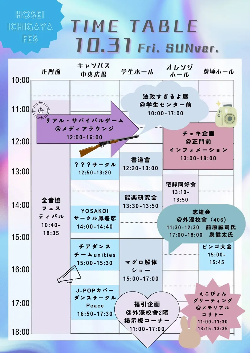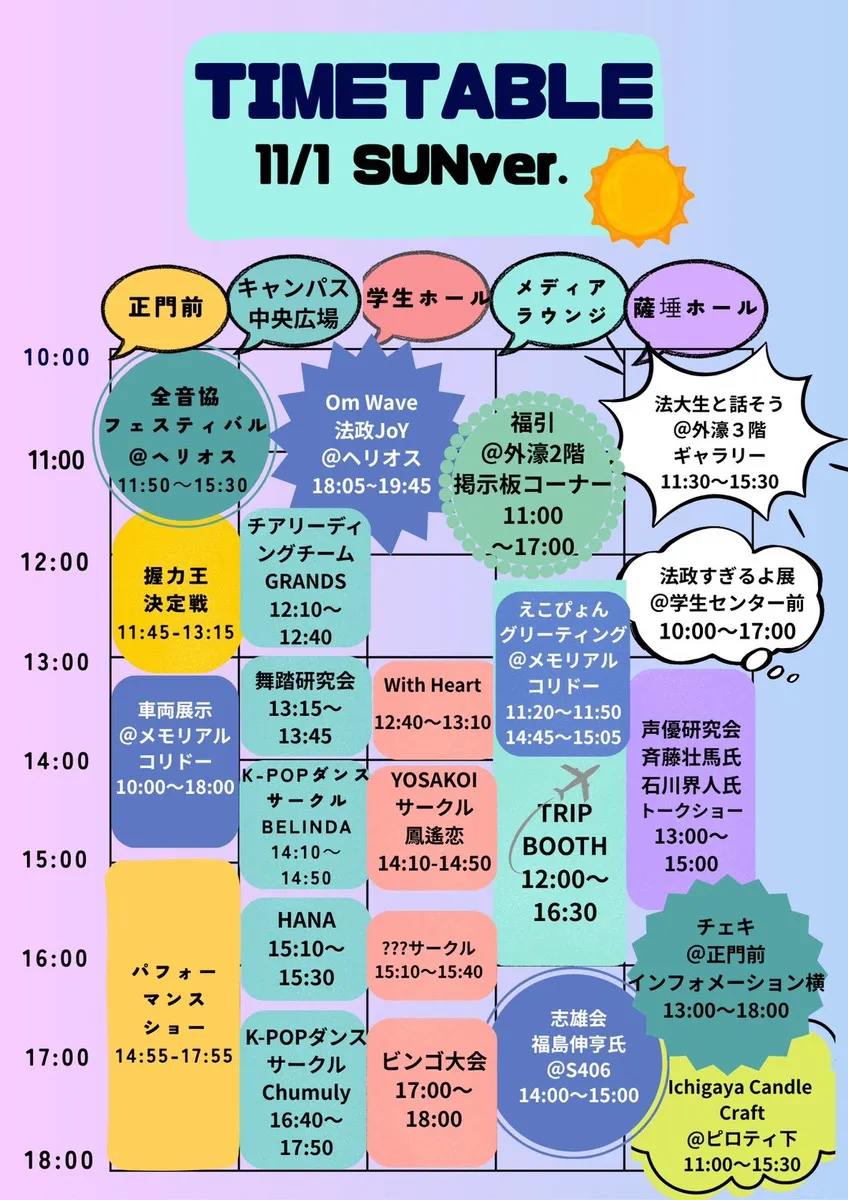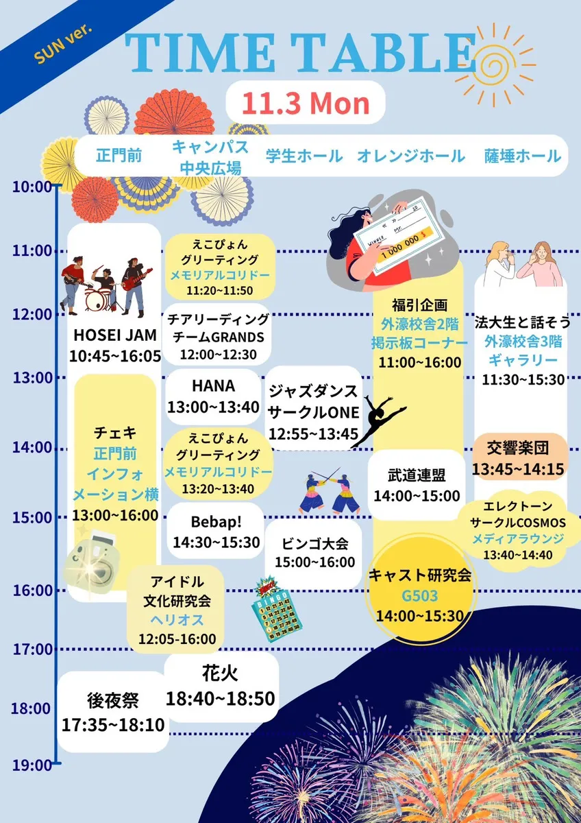 タイムスケジュール 1日 2日 3日 4日 イベントMAP 選択してください 正門前特設ステージ キャンパス中央広場 外濠校舎 富士見ゲート ボアソナードタワー 大内山校舎 富士見坂校舎 メモリアルコリドー ピロティ下 富士見坂庭園